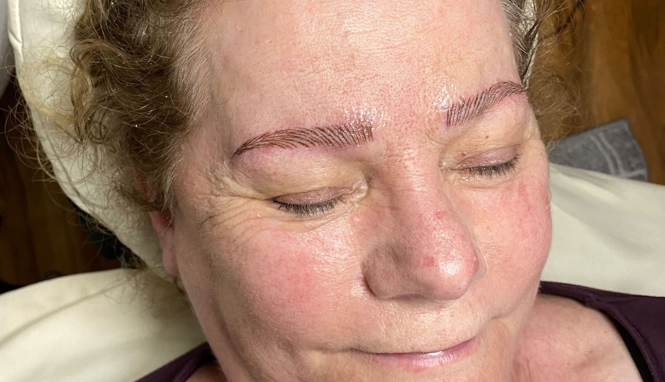 3. Using a sterile tool, the technician carefully etches hair-like strokes into the skin, applying pigment to achieve the desired color and density.